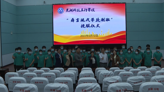 为深化学校产教融合、校企合作,促进学校职业教育高质量发展,芜湖科技工程学校与5月12日下午举办了现代学徒制班人才培养产教融合研讨会暨产业教授颁证、舜富班授服仪式,县人民政府副县长梅菲参加了会议,县教育局、县人社局相关领导,芜湖舜富精密压铸有限公司、雅葆轩、双彩智能科技、奇瑞商务车、匠左盟网络科技等企业代表参加了会议。