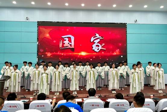 (图为本次道德讲堂“扬新风”环节,我校20春城轨班学生表演手语操《国家》)