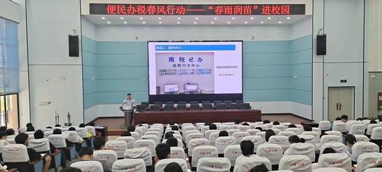 为深入贯彻落实党中央、国务院实施新的组合式税费支持政策决策部署,持续推进《2022年助力小微市场主体发展“春雨润苗”专项行动方案》的实施,南陵县税务局、南陵县工商联联合开展了“春雨润苗”专项行动。6月15日下午,南陵县一级行政执法员胡文禹为我校学生做“春雨润苗进校园”的主题讲座,旨在通过税务实操讲解,进一步巩固我校就业创业工作持续健康发展,为在校学生系好职业道路的“第一颗扣子”。