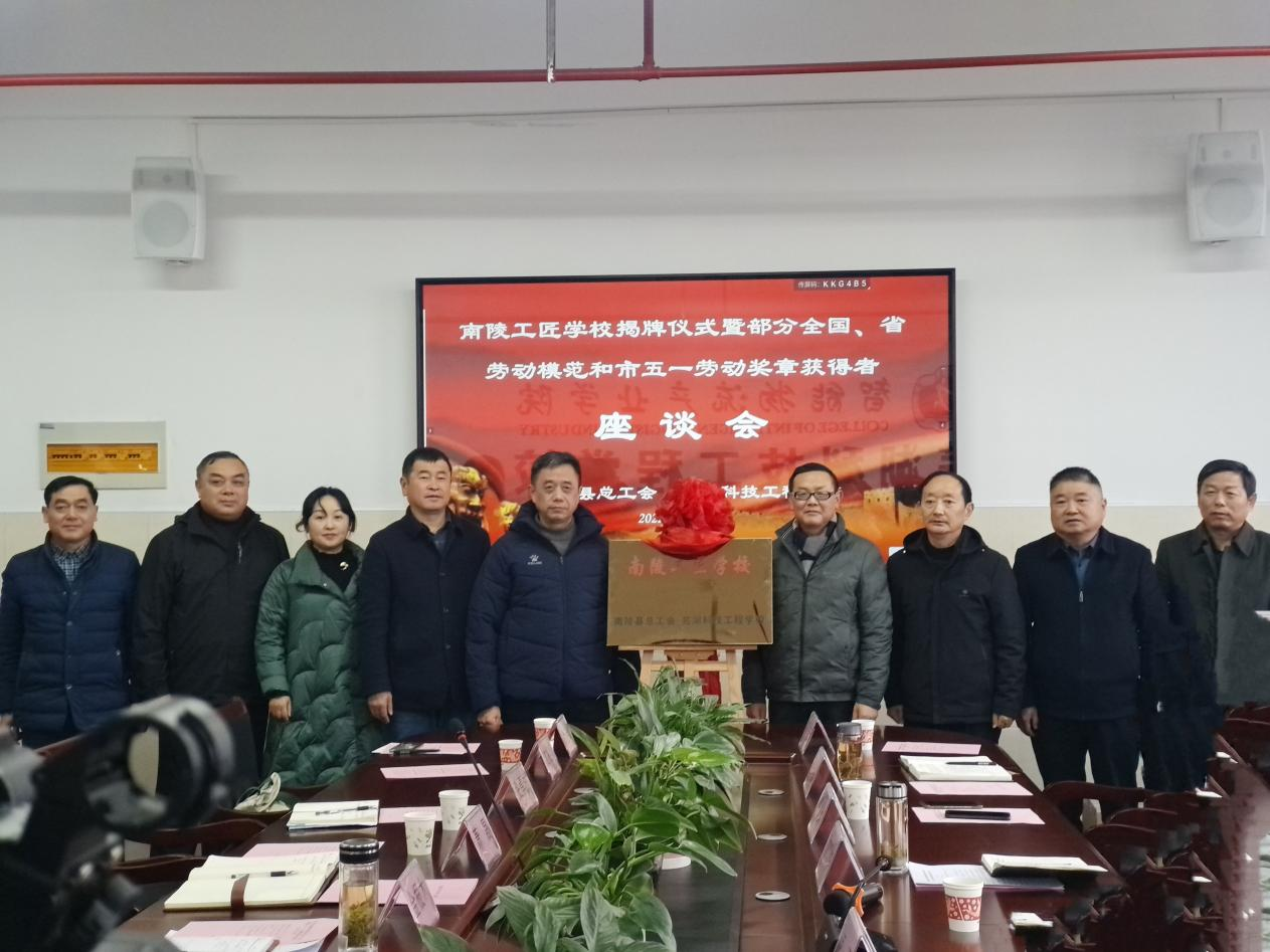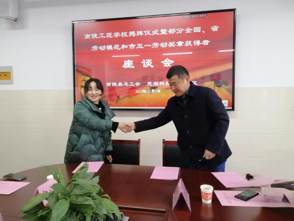 会议举行了南陵工匠学校签约和揭牌仪式,芜湖科技工程学校党支部书记金根木向部分国家和省劳动模范颁发南陵工匠学校校外教师聘用证书。会上,各位劳模及参会人员就“学习贯彻党的二十大会议精神,进一步弘扬劳动精神、劳模精神和工匠精神,倡导‘劳动光荣、技能宝贵’,如何促进南陵职业教育人才培养,在南陵社会和经济发展中积极贡献工会力量,”等方面进行了热情洋溢的座谈发言,对南陵工匠学校创办和南陵职业教育发展提出了宝贵的意见和建议。