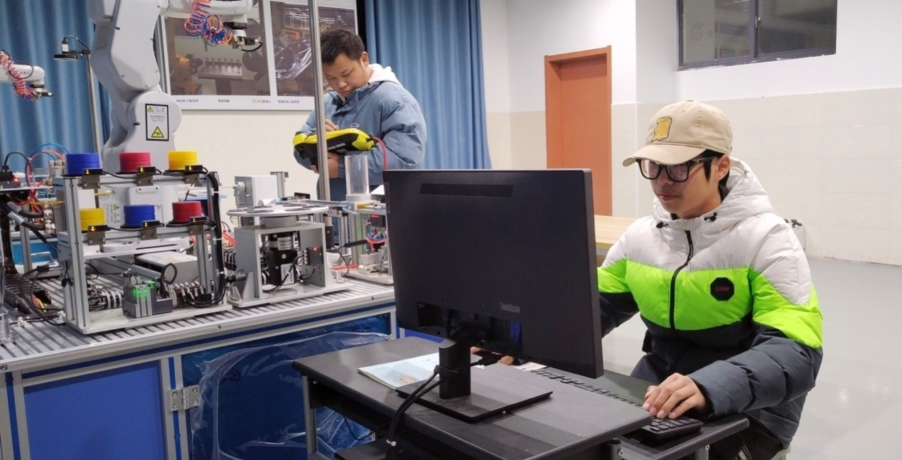 比赛由理论考试和实际操作两个环节开展角逐,第一场为理论考试,第二场为操作环节,需要两人合作默契。通过不断实践、摸索,他们逐渐掌握了一些比赛的方法与门道。随着赛程的日益临近,在实训要求上,伍致远、王伟鸣日日精进,最终把平时训练当做正式比赛一样,要求分工清楚明确,确保操作秩序井然。在实训强度上,两位同学充分利用一切在校时间,几乎全天待在工业机器人实训室备赛,全身心投入比赛。