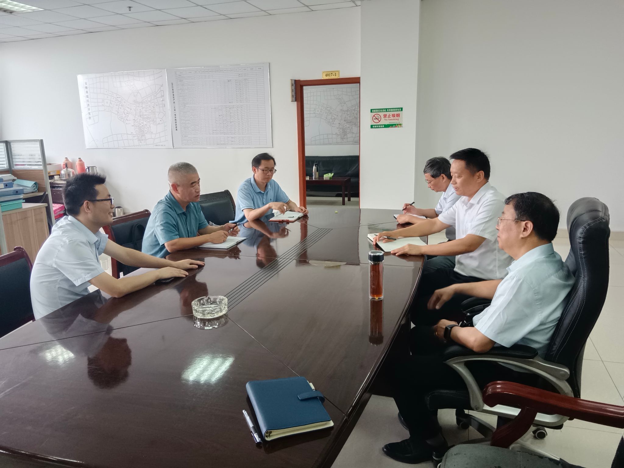 张言明、周自宝一行人首先来到了南陵县开发区管委会,与管委会主任朱陈建同志等人就芜湖职业技术学院现代物流智造学院专业设置如何对接南陵产业进行座谈。会上,周校长介绍了现代物流智造学院计划开设的相关专业、人才培养及办学特色和优势,并希望能够与开发区管委会建立更为紧密的合作关系,为学生提供更好的实践机会和就业渠道,更好服务南陵,辐射长三角。朱主任就当前南陵县企业的发展前景和人才需求与大家进行讨论,并介绍未来经开区发展规划。张言明强调,此次座谈是为了加强学校与社会各界的联系,深入了解本地企业的发展情况,为进一步深化校企合作、产教融合,做好铺垫。