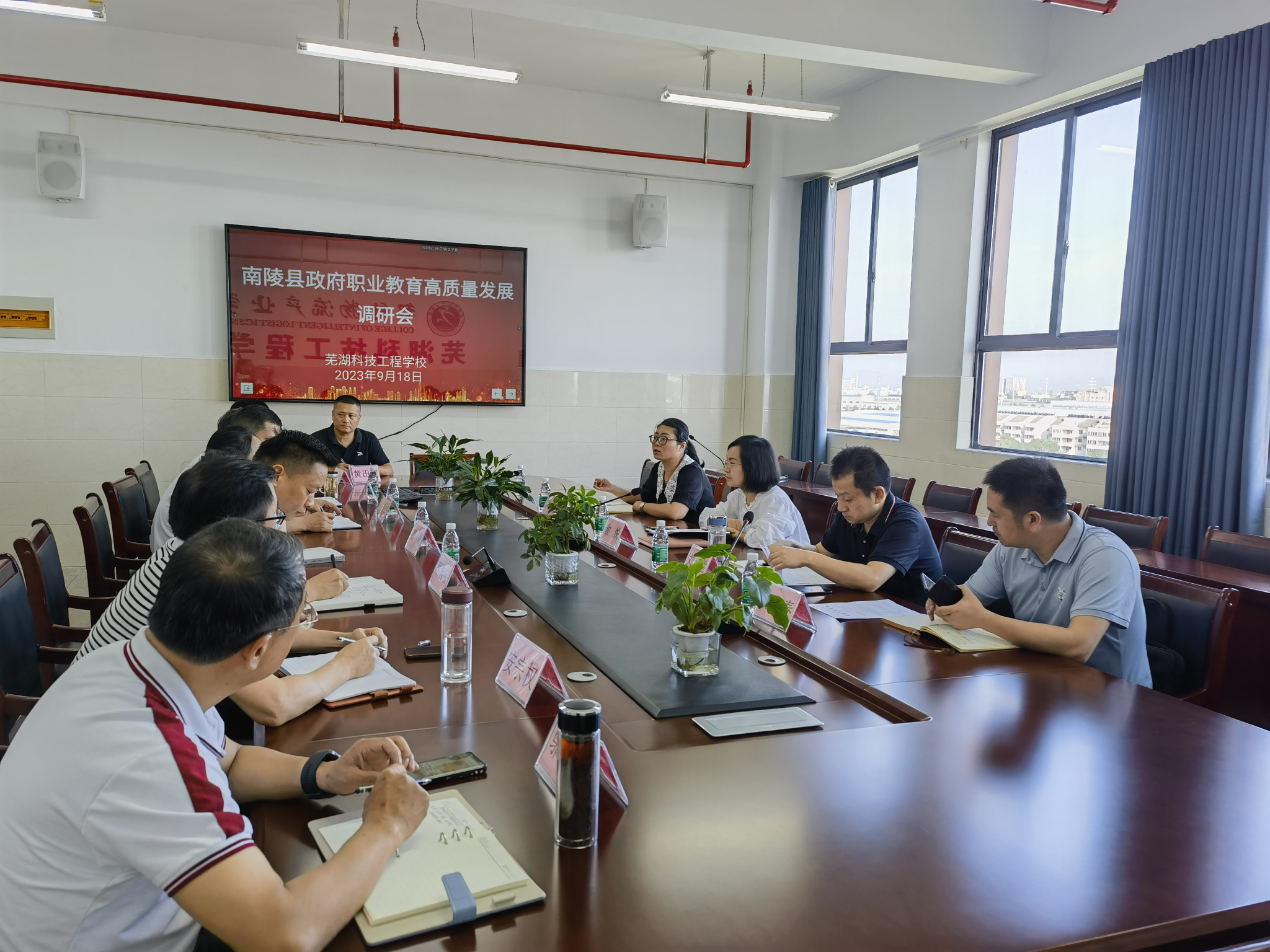 9月18日上午,南陵县人民政府副县长俞悦,南陵县教育局党委书记、局长刘作胜一行莅临我校开展南陵县职业教育高质量发展调研、交流,我校党支部书记萧晟、校长周自宝等校领导参加。