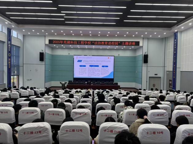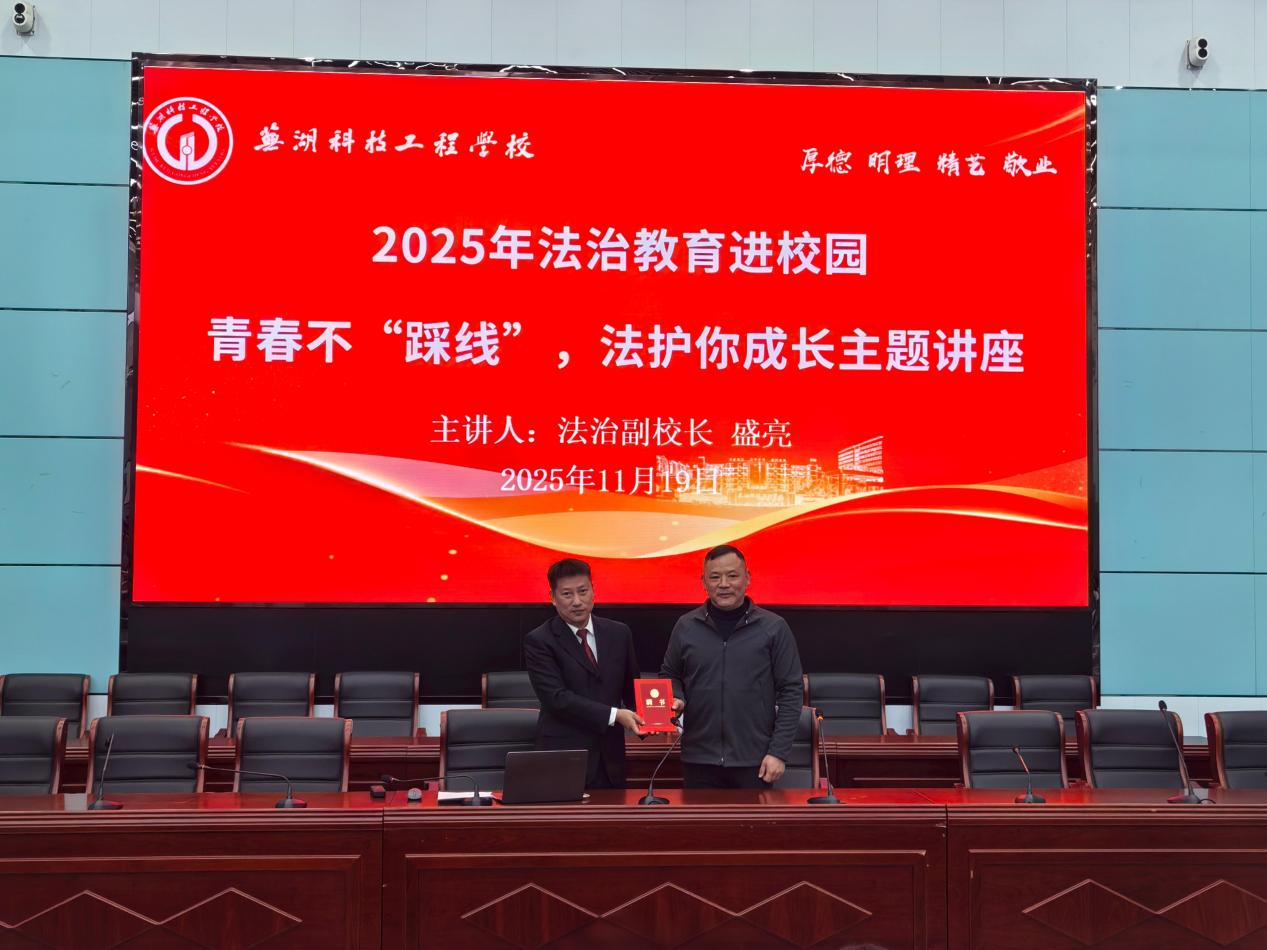 为深入推进法治校园建设,增强学生法治观念,提升自我保护能力,11月19日,芜湖科技工程学校在报告厅举行法治副校长聘任仪式暨“青春不‘踩线’ 法护你成长”主题讲座。学校党总支书记汪金素、学生处负责人、相关班主任及25级全体学生共同参加活动。
