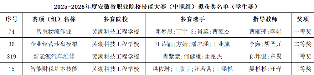 近日,2025-2026年度安徽省职业院校技能大赛(中职组)比赛结果揭晓,芜湖科技工程学校师生凭借扎实的专业功底和精湛的实操技能,在多个赛项中脱颖而出,共获一等奖1项、二等奖2项、三等奖1项。其中,在智慧物流作业赛项中勇夺一等奖,在企业经营沙盘模拟、新能源汽车维修两个赛项中斩获二等奖,在智能财税基本技能赛项中获得三等奖,充分展现了学校深耕中职教育、聚焦技能育人的扎实成效,也彰显了新时代中职学子精益求精、奋勇争先的技能风采。