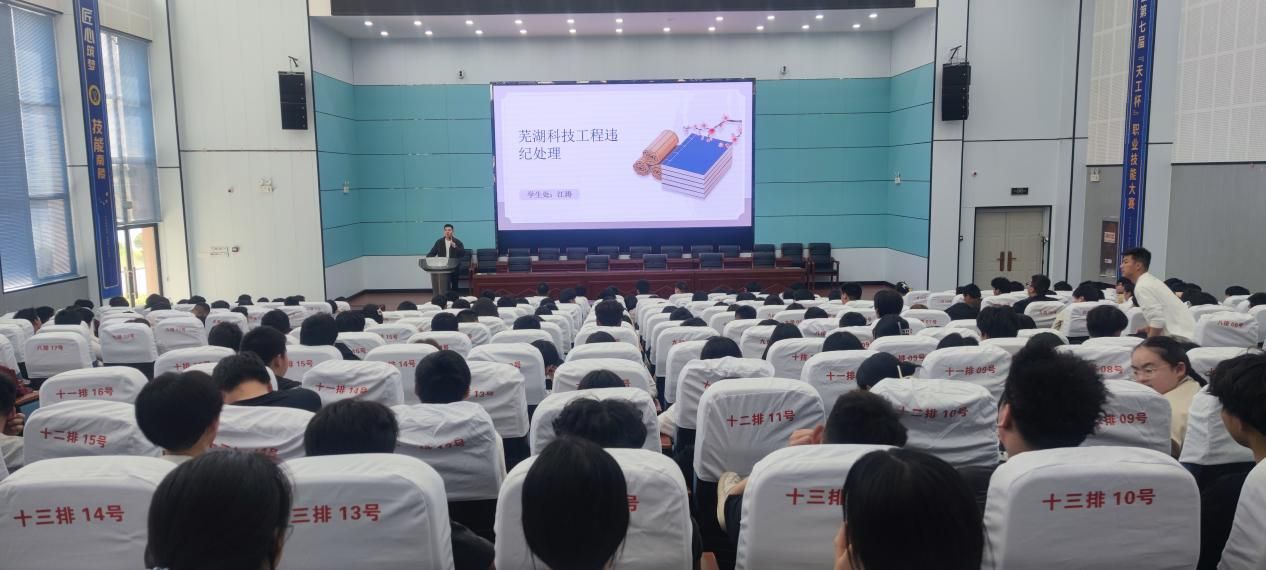 活动中,学生处负责人结合《芜湖科技工程学校学生违纪处分条例》深入解读校规校纪,以典型案例警示旷课、违规用电、考试作弊等行为的后果,并提出“校规校纪是成长的保护网,而非束缚”,希望同学们以自律精神践行。