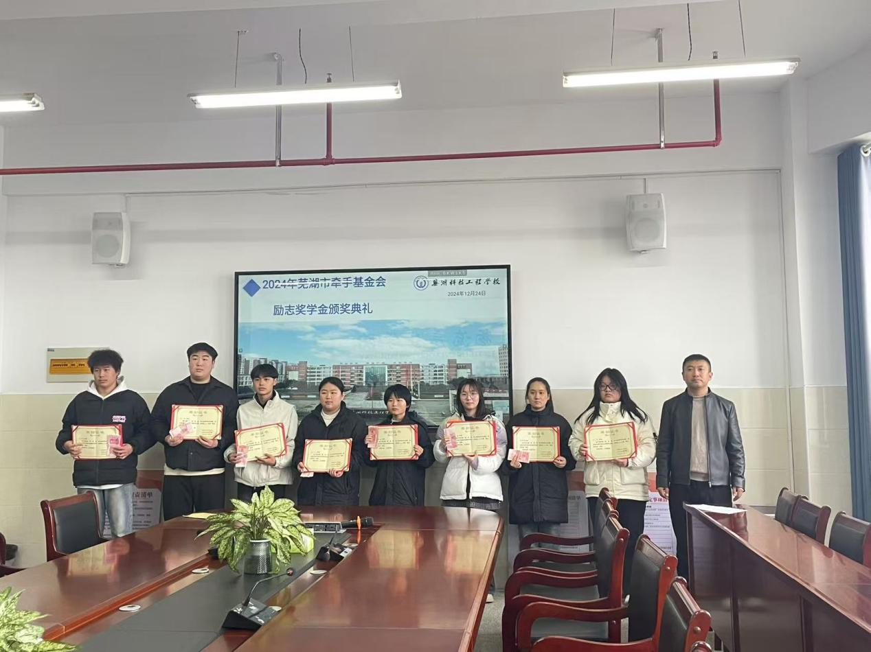 12月24日,“芜湖市牵手基金会”励志奖学金颁奖典礼在芜湖科技工程学校综合楼会议室举行。经过各班级申报、学部审核推荐、奖学金委员会评选,芜湖科技工程学校宛琴、邓梦晨、王顺宝等8名同学获得“2024年芜湖市牵手基金会”励志奖学金。