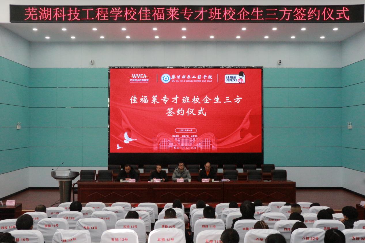 1月14日,芜湖科技工程学校与安徽佳福莱食品有限公司共建的“佳福莱专才班”签约仪式在学校报告厅举行。校领导、招生就业与校企合作处负责人、企业代表、“佳福莱专才班”全体学生和家长参加。此次签约标志着校企双方在深化产教融合、共育高素质技能人才方面迈出实质性步伐,也为学生成长成才搭建起校企联动的优质平台。