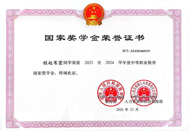 颁奖仪式在庄严的国歌声中拉开帷幕,学校相关负责人为2022级程赵苇萱、2023级肖紫豪两位同学颁发荣誉证书,并发表讲话,向获得中等职业教育国家奖学金的同学表示热烈祝贺,并充分肯定了他们在学业、技能和综合素质等方面的优异表现;希望同学们以此为榜样,努力提升专业技能,锤炼品德修养,争做新时代高素质技能人才。