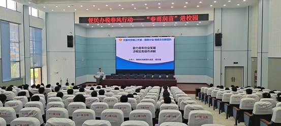 为深入贯彻落实党中央、国务院实施新的组合式税费支持政策决策部署,持续推进《2022年助力小微市场主体发展“春雨润苗”专项行动方案》的实施,南陵县税务局、南陵县工商联联合开展了“春雨润苗”专项行动。6月15日下午,南陵县一级行政执法员胡文禹为我校学生做“春雨润苗进校园”的主题讲座,旨在通过税务实操讲解,进一步巩固我校就业创业工作持续健康发展,为在校学生系好职业道路的“第一颗扣子”。